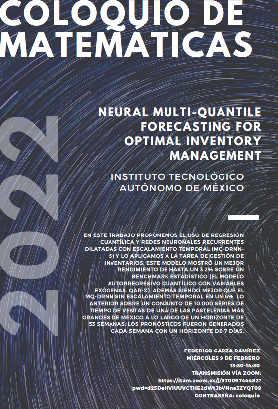 Resumen: En este trabajo proponemos el uso de regresión cuantílica y redes neuronales recurrentes dilatadas con escalamiento temporal (MQ-DRNN-s) y lo aplicamos a la tarea de gestión de inventarios. Este modelo mostró un mejor rendimiento de hasta un 3.2% sobre un benchmark estadístico (el modelo autorregresivo cuantílico con variables exógenas, QAR-X), además siendo mejor que el MQ-DRNN sin escalamiento temporal en un 6%. Lo anterior sobre un conjunto de 10.000 series de tiempo de ventas de una de las pastelerías más grandes de México a lo largo de un horizonte de 53 semanas; los pronósticos fueron generados cada semana con un horizonte de 7 días.