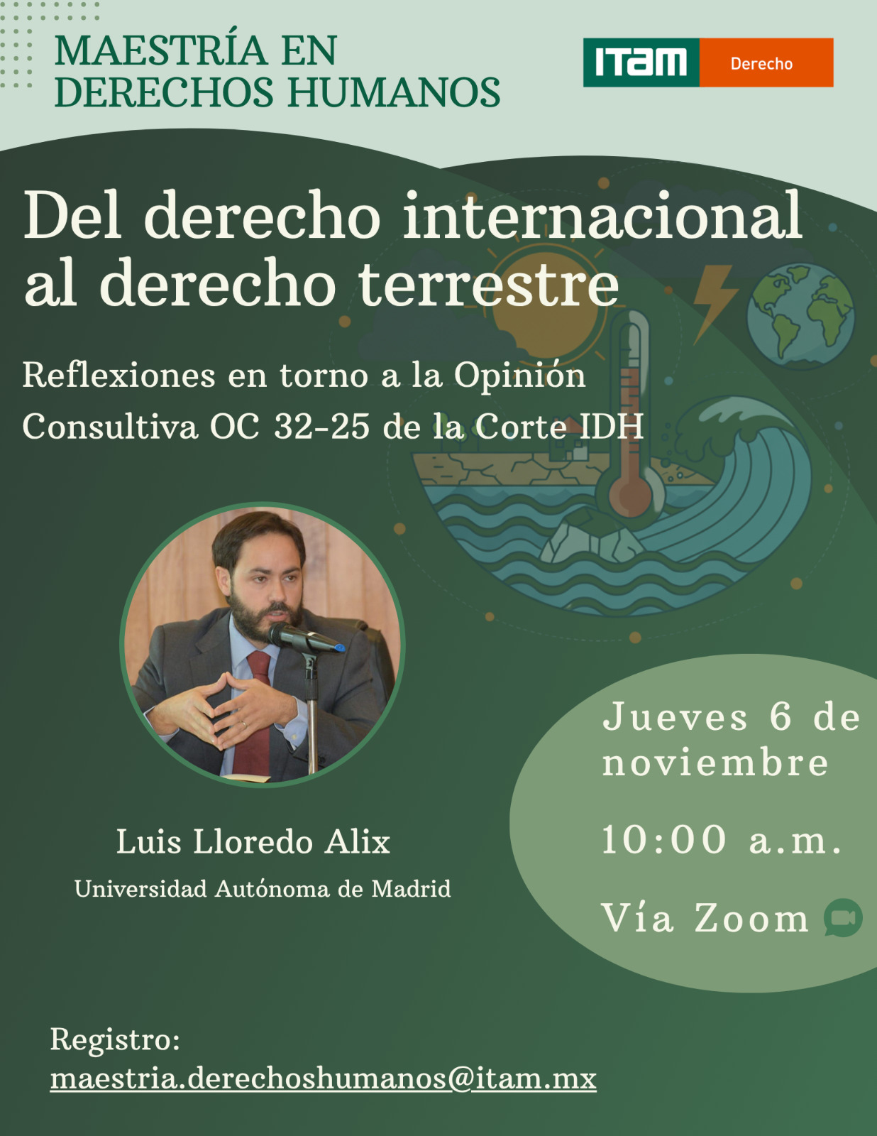 La Maestría en Derechos Humanos y Garantías del ITAM se complace en invitarlos a la conferencia "Del Derecho Internacional al Derecho Terrestre. Reflexiones en torno a la opinión consultiva OC 32-25 de la Corte IDH" que se llevará a cabo el jueves 6 de noviembre a las 10 am. vía zoom.