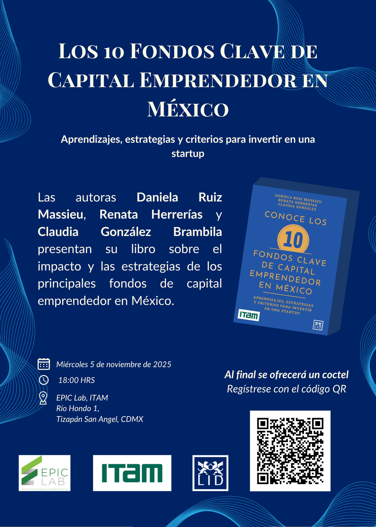 Te invitamos a la presentación de "Los 10 Fondos Clave de Capital Emprendedor en México", una obra de Daniela Ruiz Massieu, Renata Herrerías y Claudia González Brambila, obra sobre el impacto y las estrategias de los principales fondos de capital emprendedor en México.