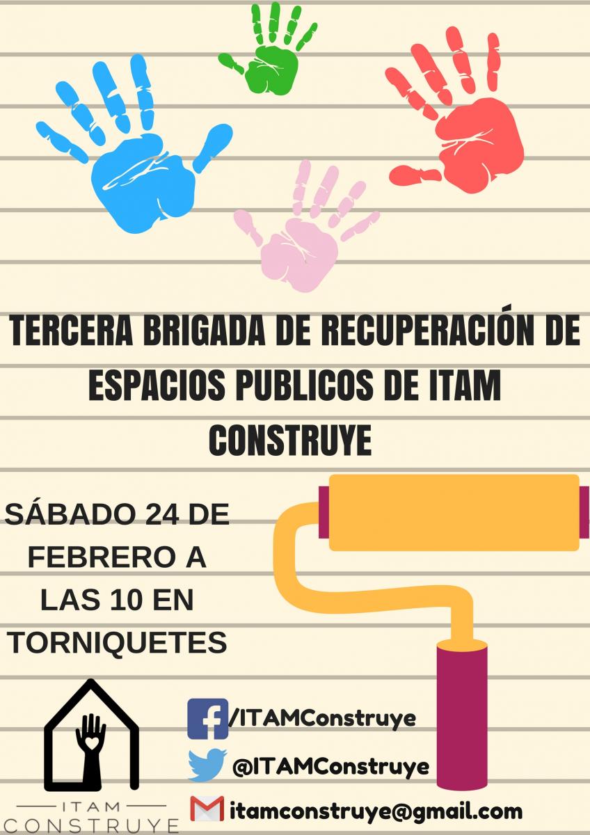 ITAM Construye se enorgullece de invitarlos a la tercera brigada de recuperación de espacios públicos de este año. Se realizará este sábado 24 de febrero en el parque que se ubica entre las calles Morelos y Puebla. El punto de reunión es torniquetes a las 10:00 a.m.