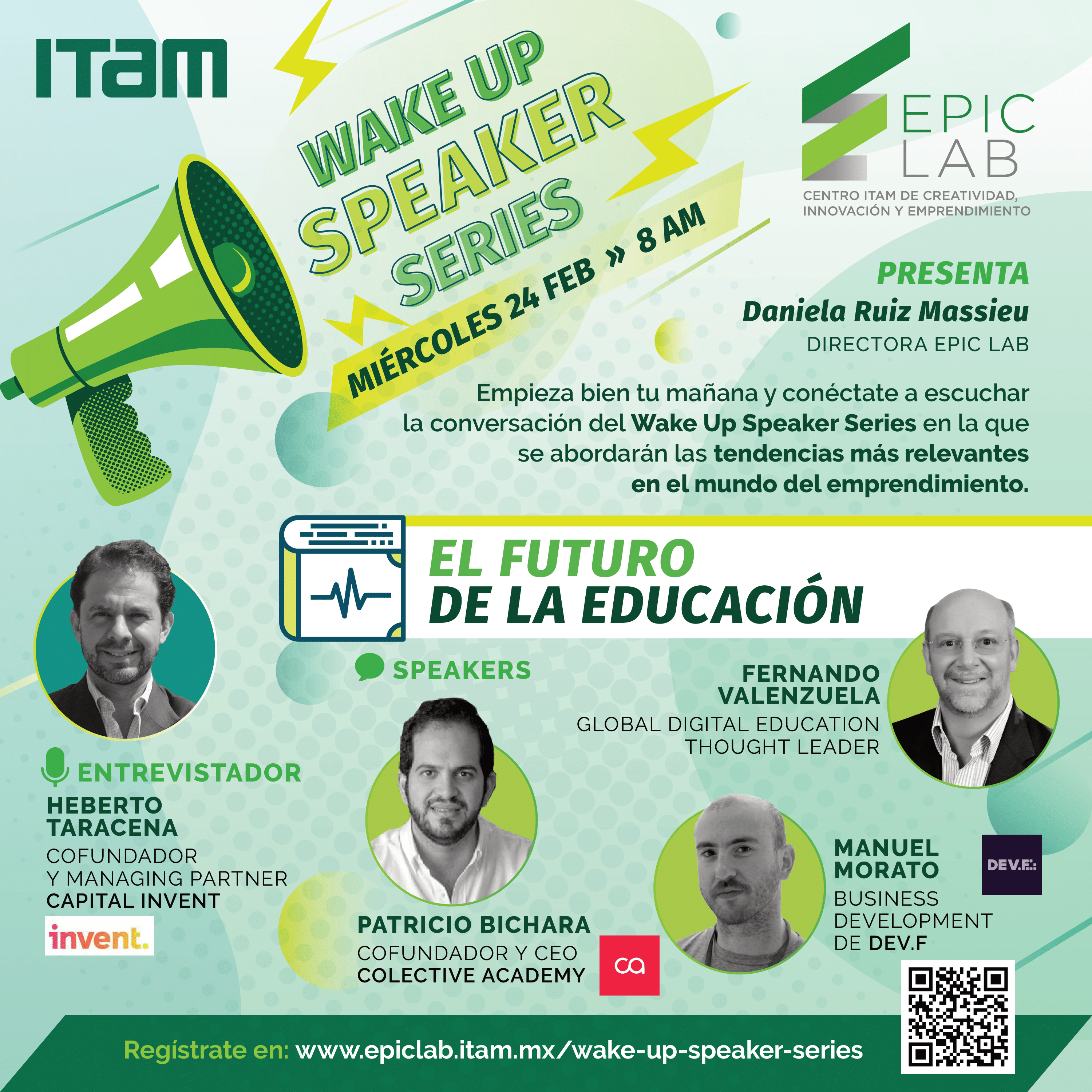 El próximo miércoles 24 de febrero, te esperamos en nuestra segunda sesión del Wake-Up Speaker Series, iniciativa del EPIC Lab, en la que podrás escuchar a Heberto Taracena (Cofundador y Managing Partner Capital Invent) en una plática con Fernando Valenzuela (Global Digital Education Thought Leader), Patricio Bichara (Cofundador y CEO Collective Academy) y Manuel Morato (Business Development de Dev.f).