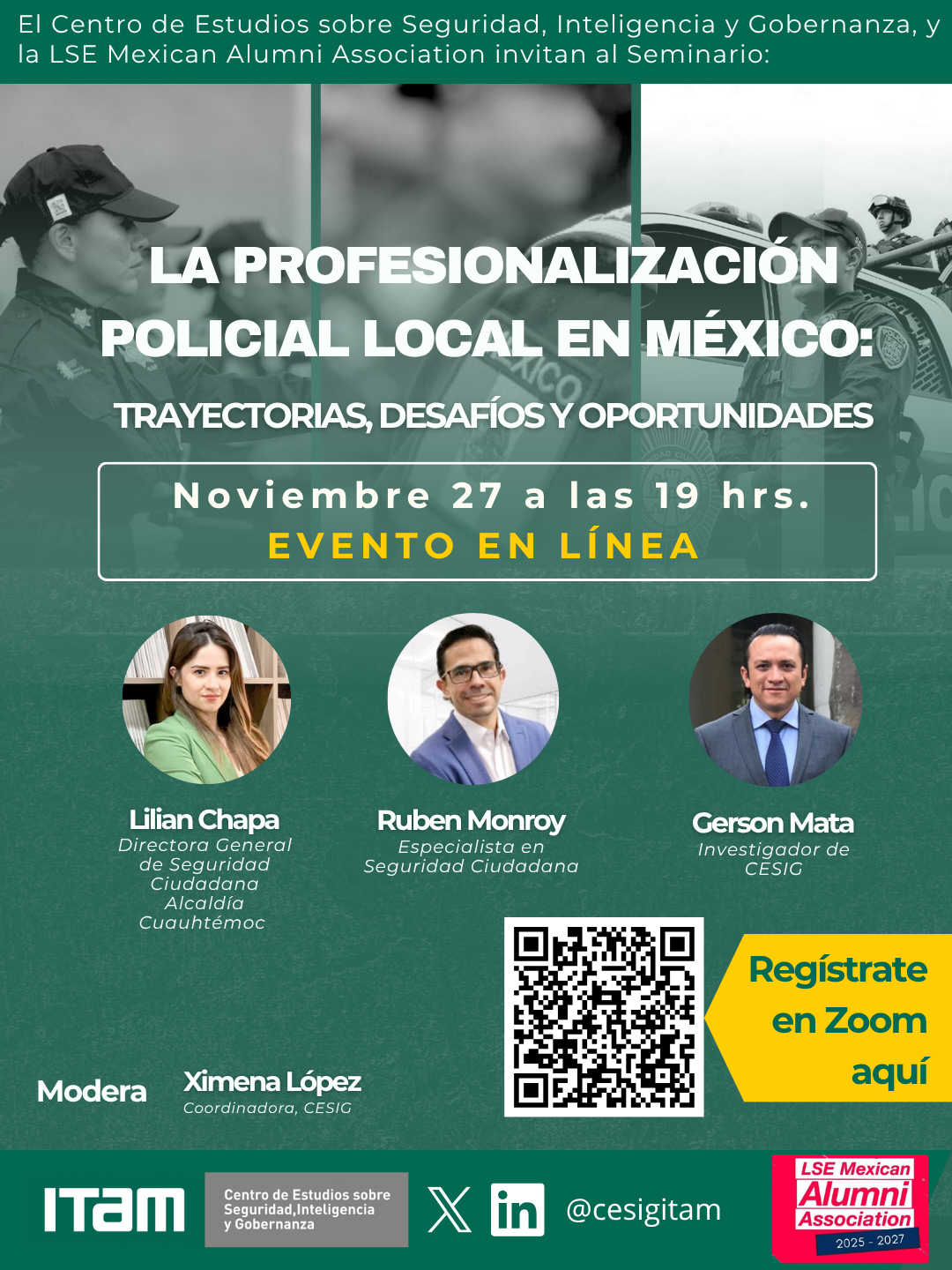 El Centro de Estudios sobre Seguridad, Inteligencia y Gobernanza (CESIG) del ITAM y la LSE Mexican Alumni Association te invitan al Seminario Virtual “La profesionalización policial local en México: trayectorias, desafíos y oportunidades”.