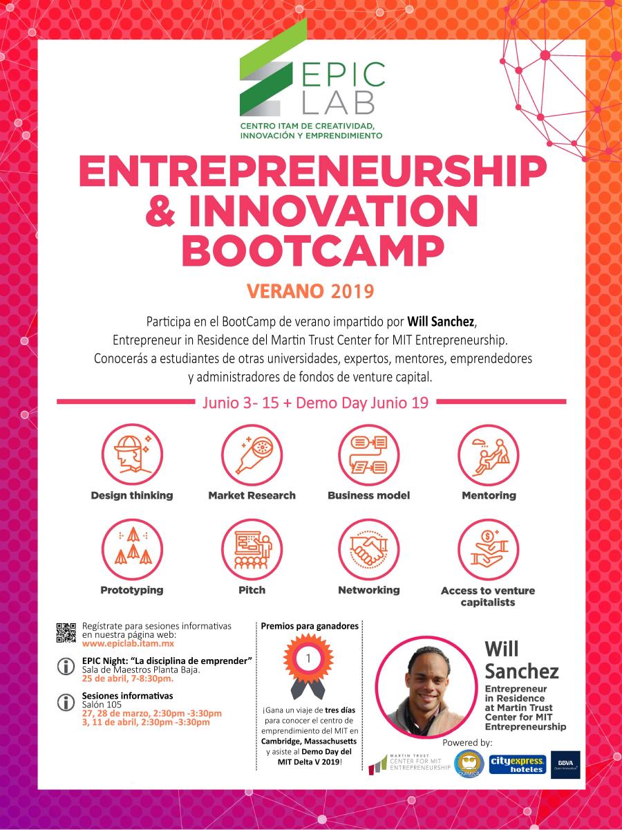 El EPIC Lab te invita a participar en el Bootcamp 2019 este verano, donde estamos buscando estudiantes de licenciatura, ingeniería o maestría que estén interesados en involucrarse en el ecosistema empresarial, y deseen desarrollar sus habilidades y conocimientos en el espíritu empresarial.
