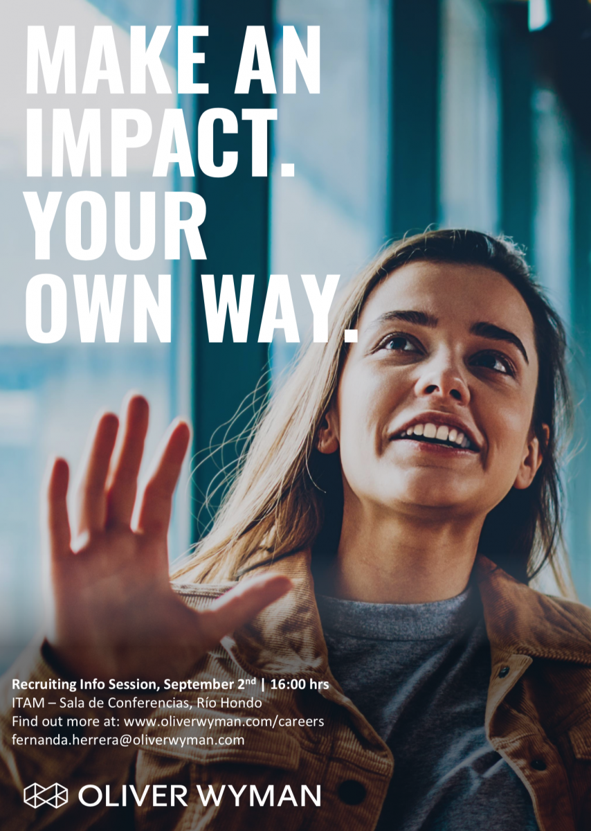 Oliver Wyman, en conjunto con la Bolsa de Trabajo, invita a su presentación, dirigida a alumnos de los 2 últimos semestres y recién egresados de todas las licenciaturas e ingenierías.