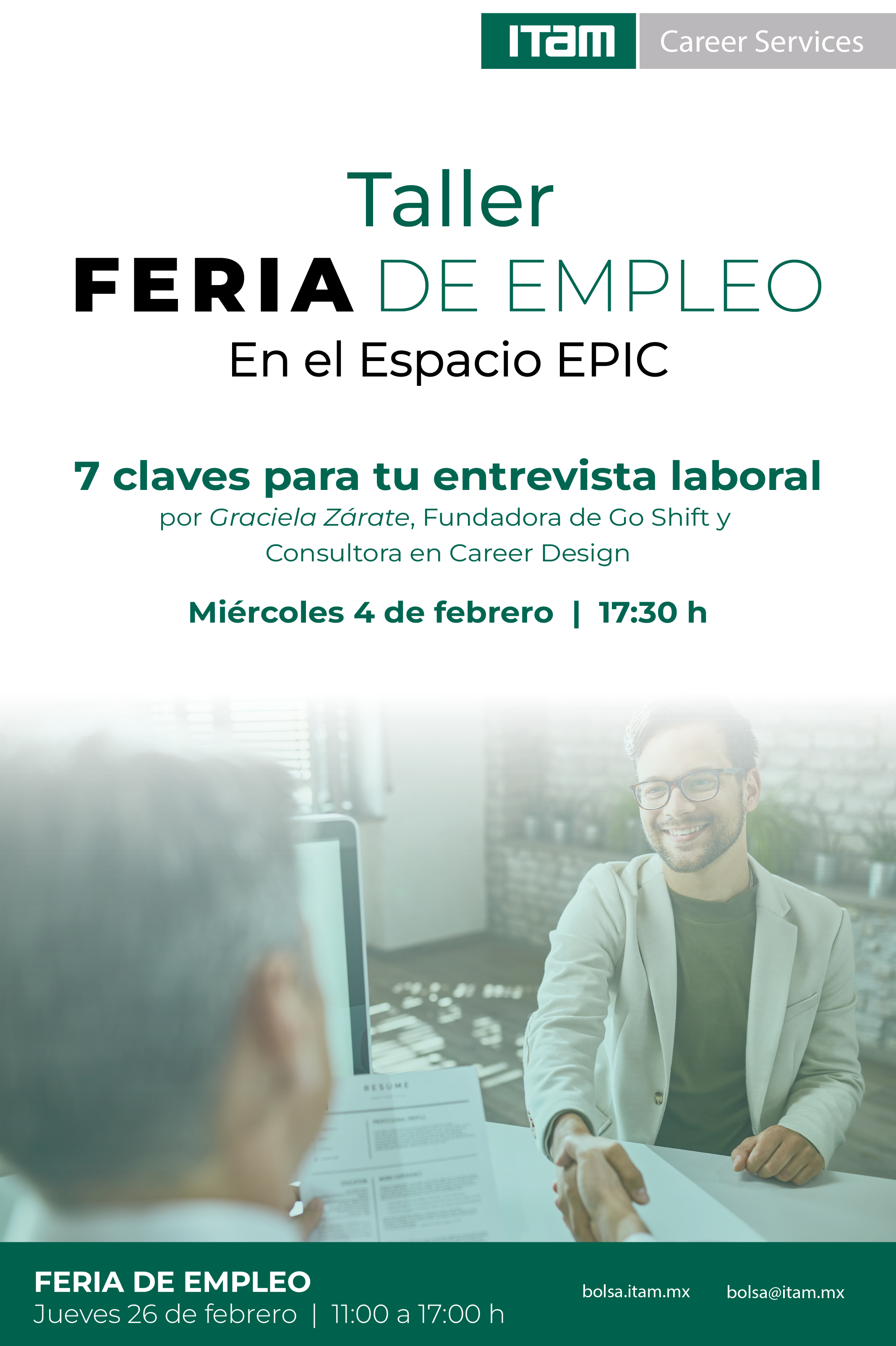La Oficina de Career Services del ITAM te invita a su taller presencial "7 claves para tu entrevista laboral", dirigida a todos los alumnos y egresados de todas las licenciaturas e ingenierías.