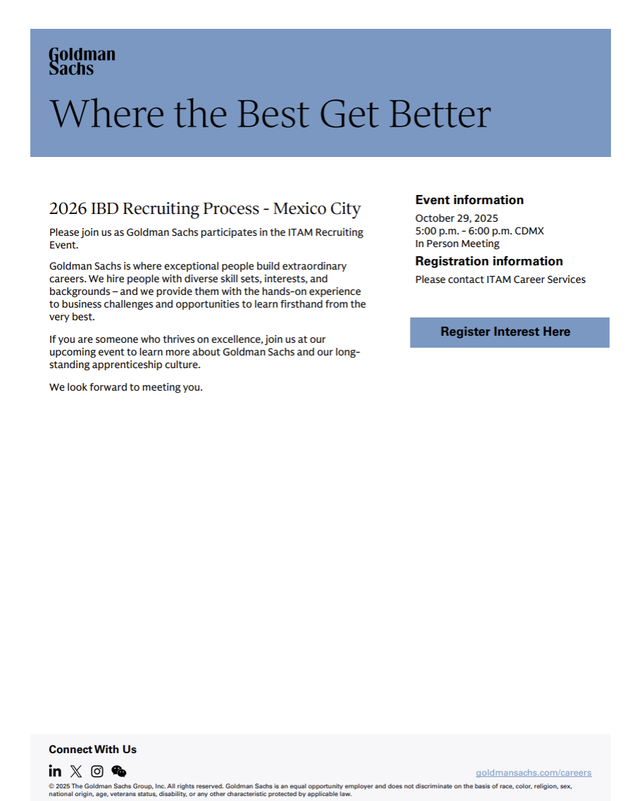 Career Services del ITAM invita a la sesión de reclutamiento presencial de Goldman Sachs