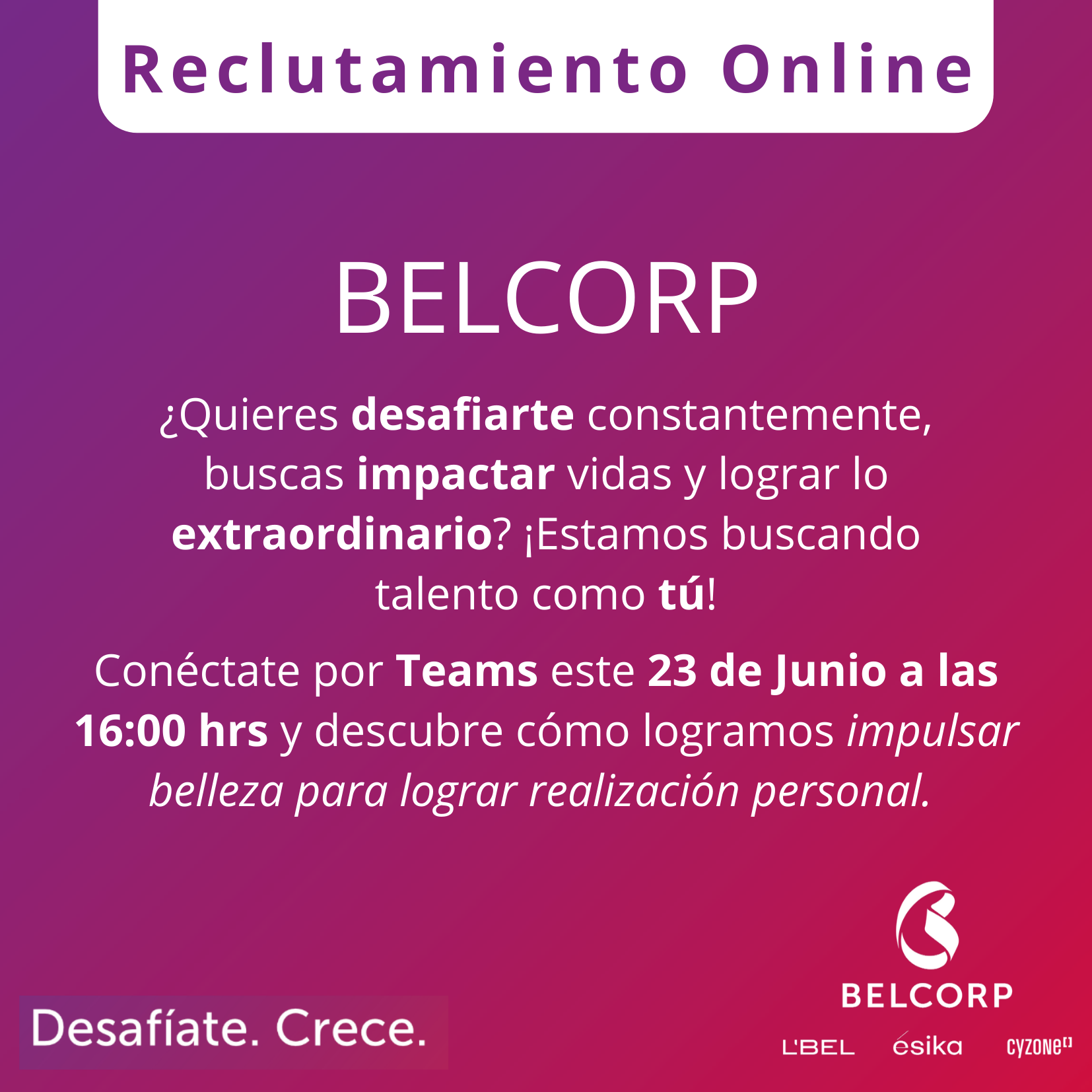 Belcorp en conjunto con la Oficina de Career Services del ITAM te invita a la presentación de su sesión de reclutamiento remota, dirigida a alumnos que cursen sus últimos dos semestres de las licenciaturas en Actuaría, Administración, Contaduría Pública y Estrategia Financiera, Dirección Financiera, Economía, Matemáticas Aplicadas, Relaciones Internacionales y todas las ingenierías, así como recién egresados (máximo dos años de haber concluido sus estudios).