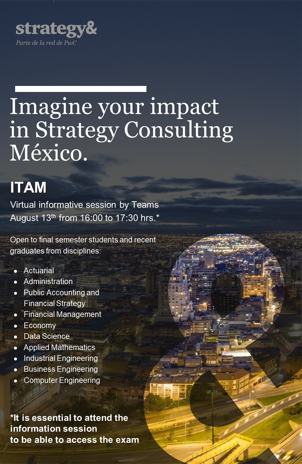 Strategy& en conjunto con la Oficina de Career Services del ITAM te invita a su sesión de reclutamiento remota, dirigida a alumnos de último semestre y recién egresados (máximo 2 años de haber egresado) de Actuaría, Administración, Ciencia de Datos, Contaduría Pública y Estrategia Financiera, Dirección Financiera, Economía, Matemáticas Aplicadas y de las Ingenierías en Computación, Industrial y Negocios.