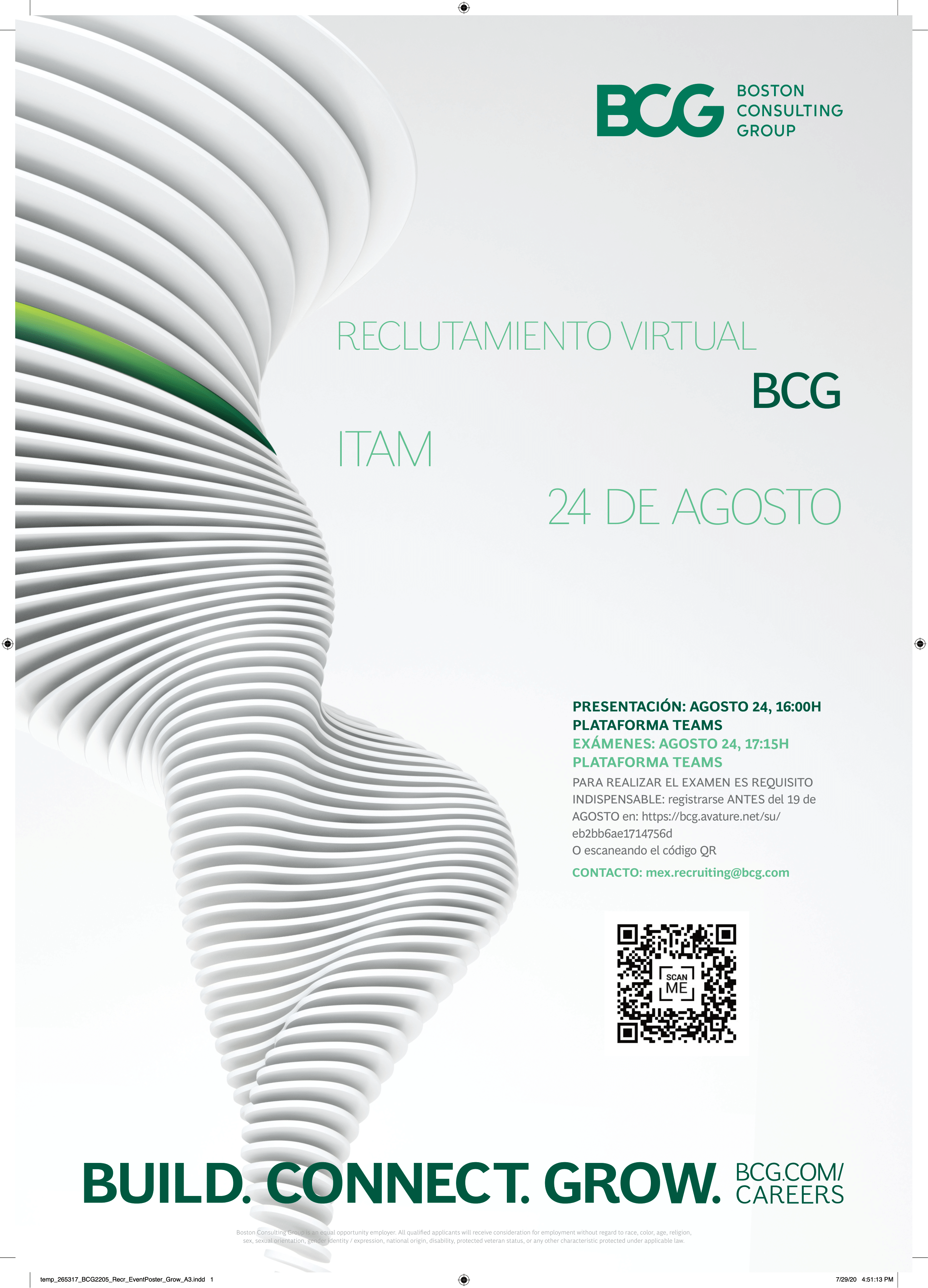 Boston Consulting Group en conjunto con la Oficina de Career Services del ITAM te invita a su sesión de reclutamiento remota y aplicación de examen, dirigido a alumnos de los 2 últimos semestres y exalumnos (máximo 2 años de experiencia) de todas las licenciaturas e ingenierías.