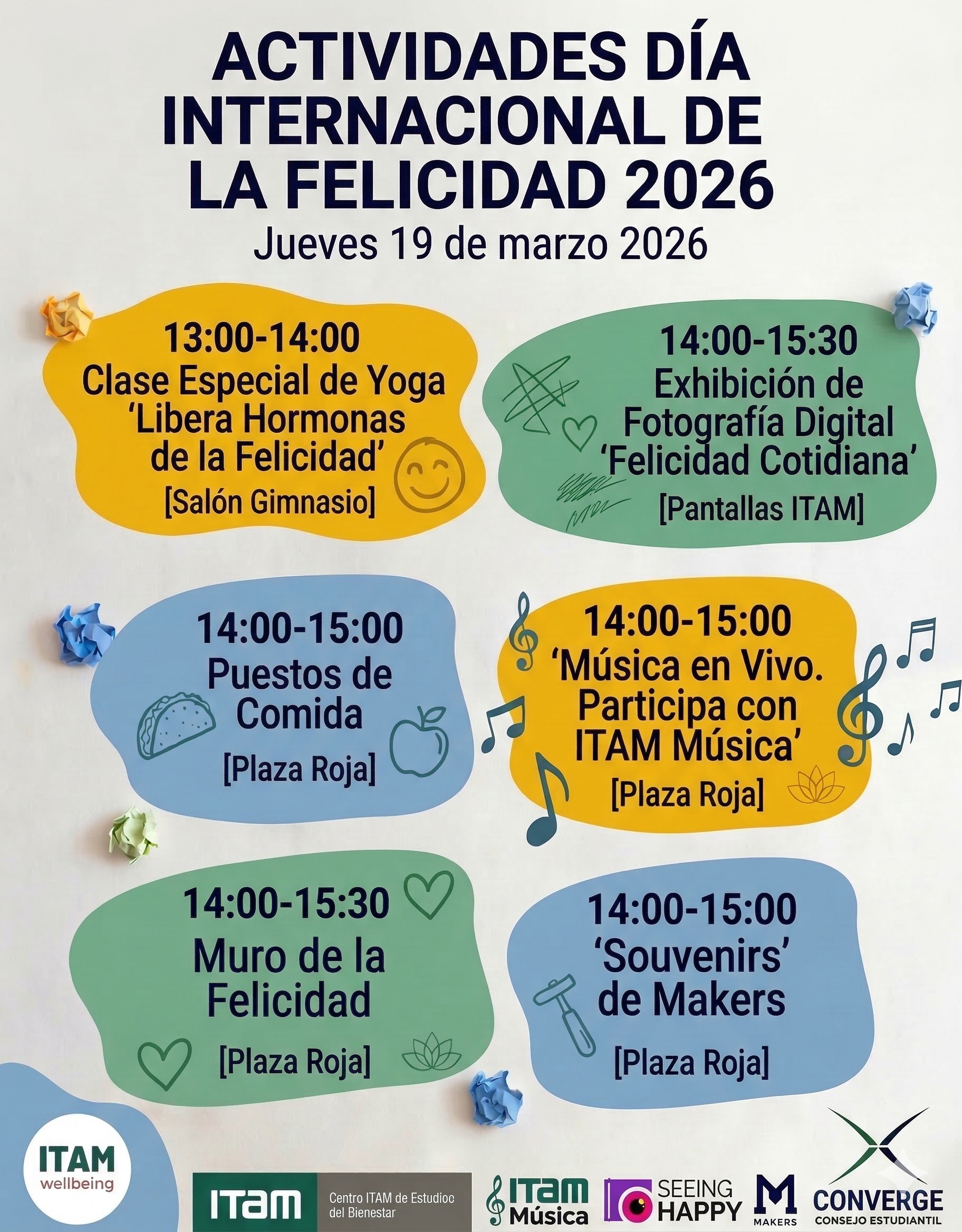 El 20 de marzo se celebra el Día Internacional de la Felicidad, instituido por la ONU en el 2012 para reconocer que la felicidad y el bienestar son aspiraciones universales de las personas. Acompáñanos a celebrarlo en el ITAM el jueves 19 de marzo, de 13:00 a 15:30 hrs.