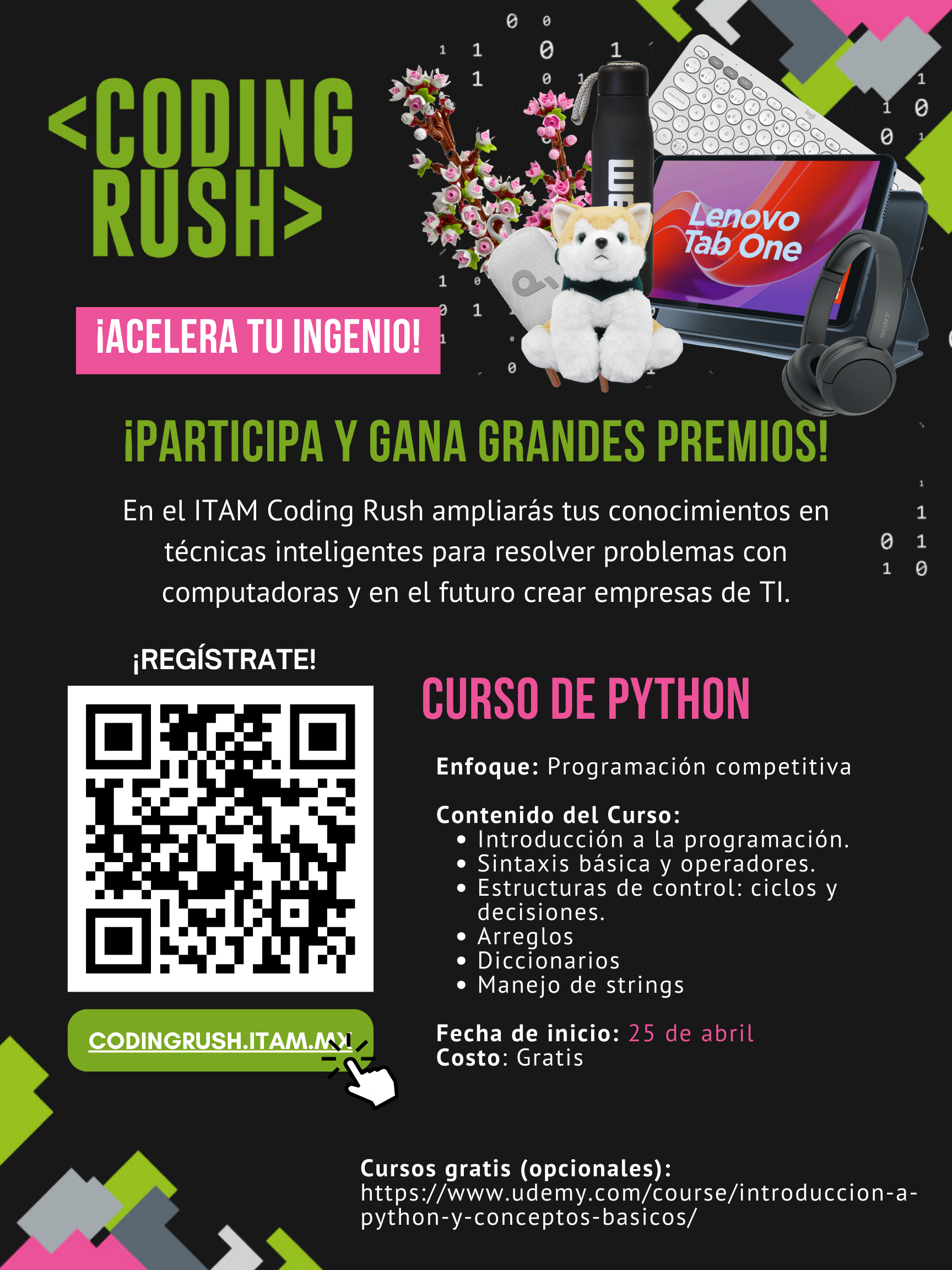 Coding Rush es la oportunidad de empezar con Python, entrar a la programación competitiva y vivir la experiencia del ITAM.