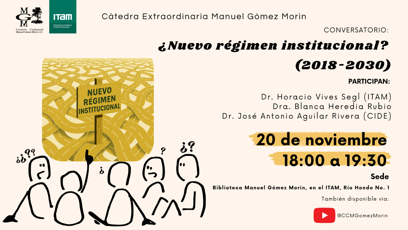 En el marco de la Cátedra Extraordinaria Manuel Gómez Morin, el Centro Cultural Manuel Gómez Morin y el Departamento Académico de Estudios Generales abordarán el tema ¿Hacia dónde van las instituciones mexicanas en el siglo XXI? con el conversatorio: ¿Nuevo régimen institucional? (2018-2030)
