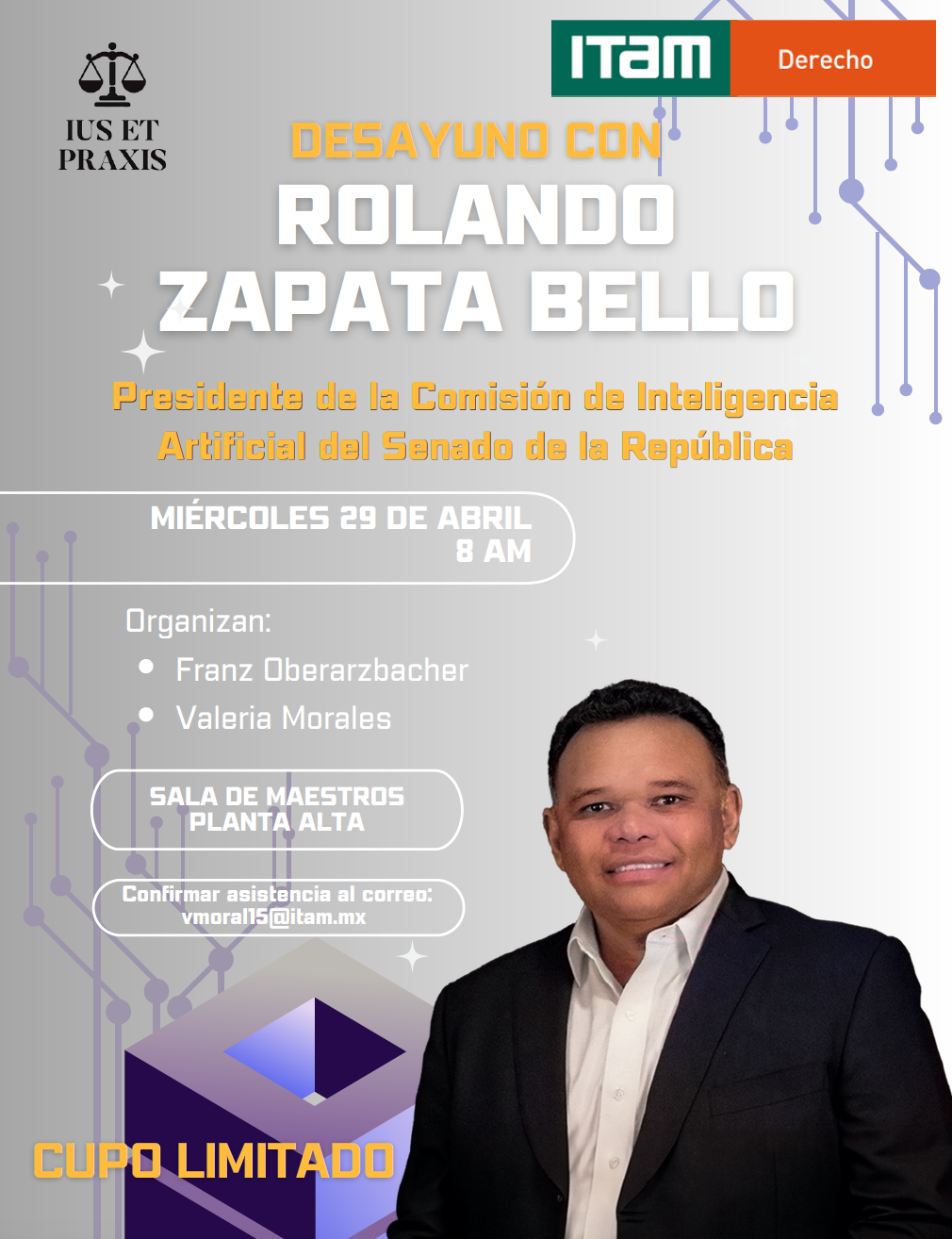 La representación de alumnos de Derecho del ITAM en colaboración con el Departamento Académico de Derecho, te invitan a un desayuno con el Senador Rolando Zapata Bello, Presidente de la Comisión de Inteligencia Artificial del Senado de la República, en el cual conversaremos sobre las implicaciones que la regulación de la inteligencia artificial podría tener en el marco jurídico.