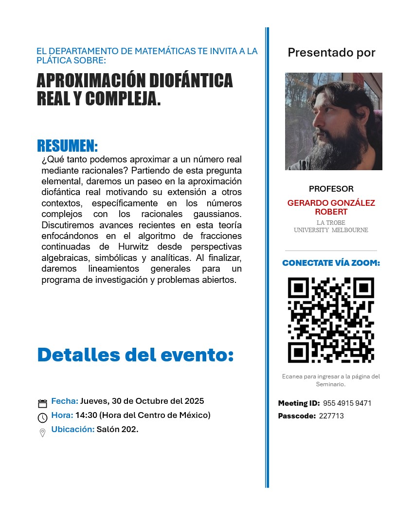 EL DEPARTAMENTO DE MATEMÁTICAS TE INVITA A LA PLÁTICA SOBRE: APROXIMACIÓN DIOFÁNTICA REAL Y COMPLEJA.