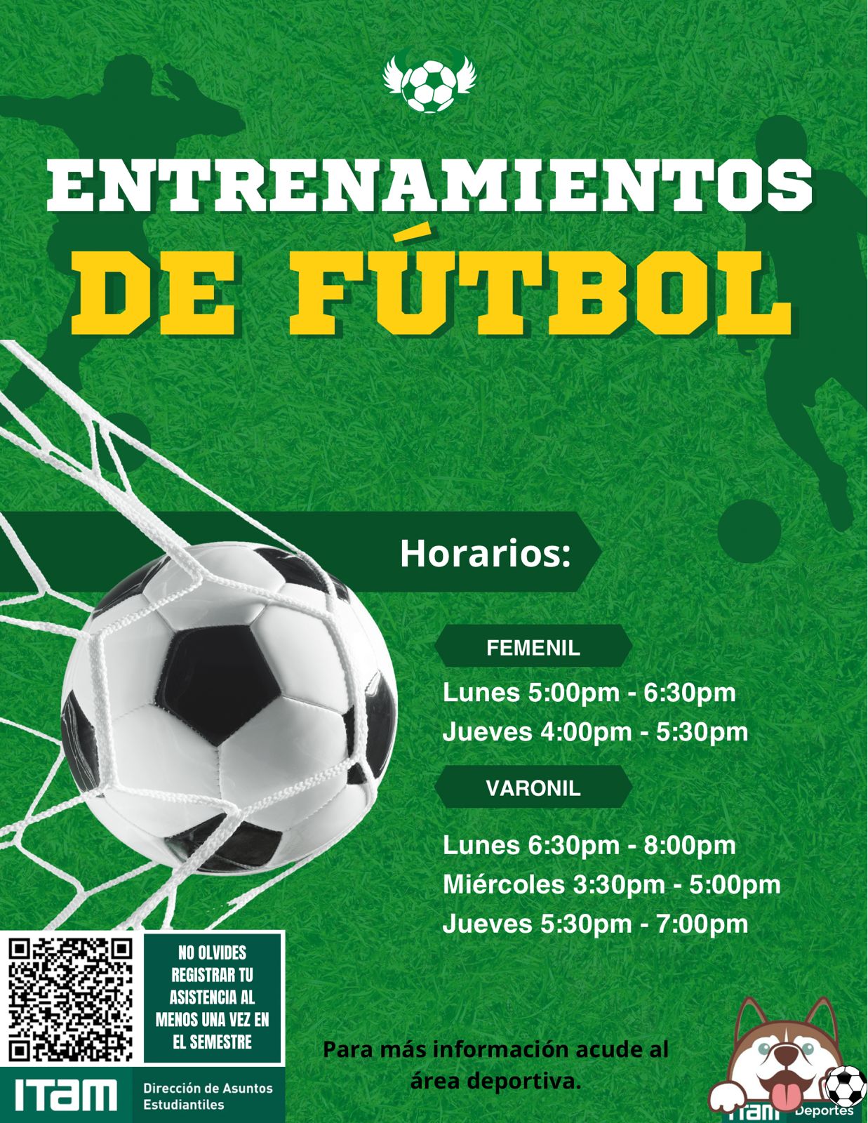 Entrenamiento femenil: lunes de 5:00 pm a 6:30 pm y jueves de 4:00 pm a 5:30 pm.