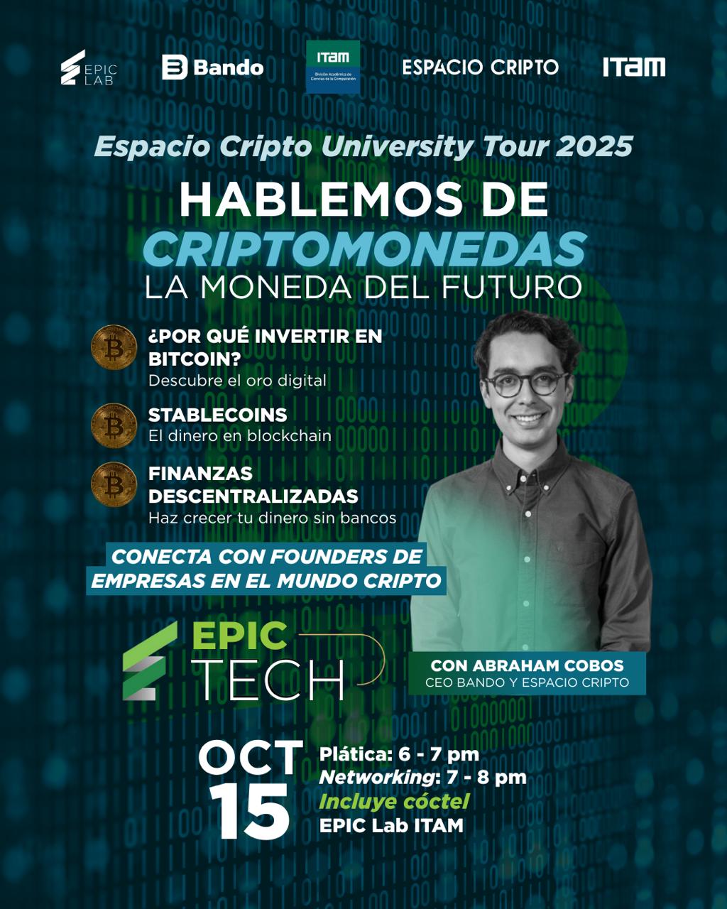 Te invitamos a la EPIC Tech “Hablemos de Criptomonedas: la moneda del futuro”, un espacio para adentrarnos en el mundo de las finanzas digitales y descubrir cómo las nuevas tecnologías están transformando la manera en que usamos y entendemos el dinero.