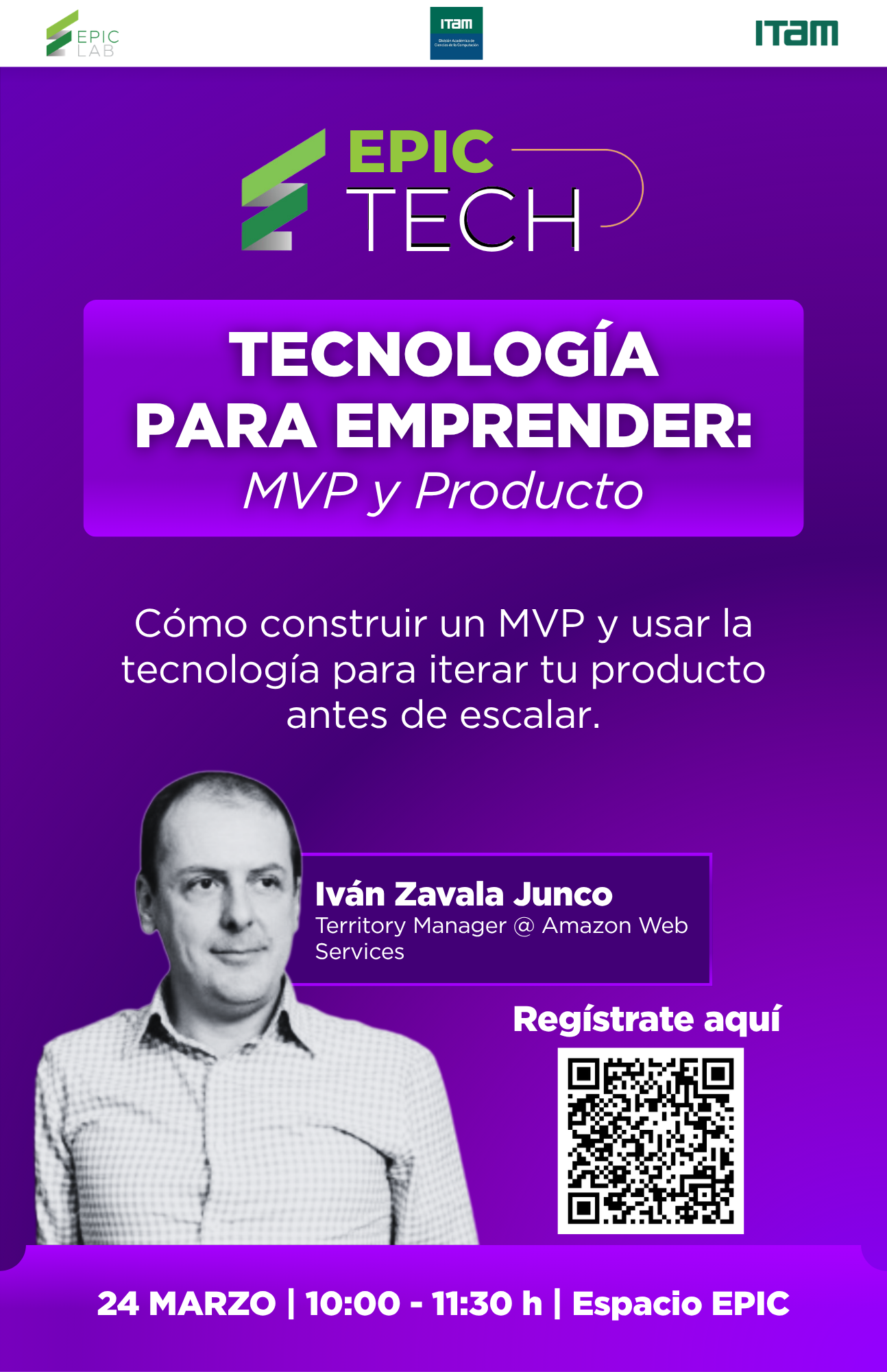 La charla será impartida por Iván Zavala Junco, Territory Manager en Amazon Web Services (AWS), quien comparte una perspectiva práctica sobre cómo la tecnología puede habilitar proyectos emprendedores, acelerar ciclos de prueba y apoyar el crecimiento de productos digitales.