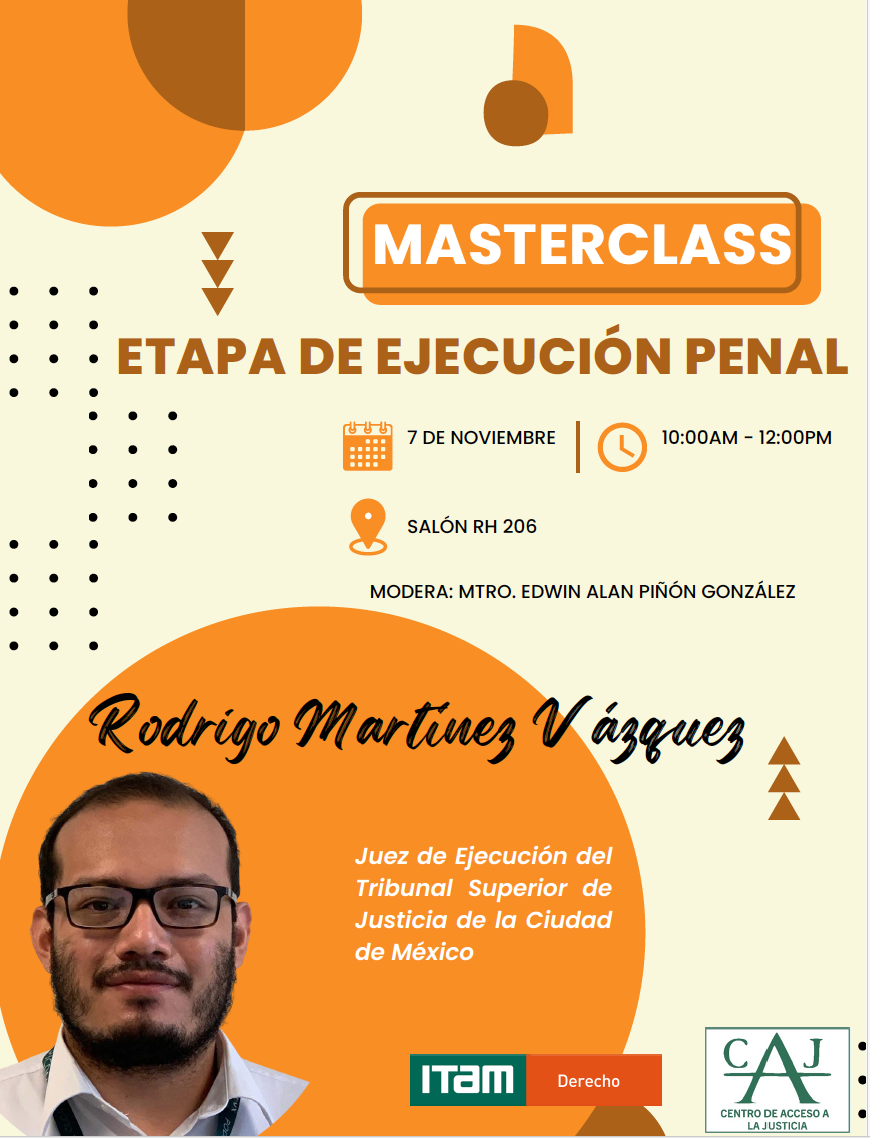 La Clínica Penal contra Violaciones Graves a Derechos Humanos del ITAM y el Centro de Acceso a la Justicia del ITAM se complacen en invitarlos a la conferencia "Etapa de Ejecución Penal" que se llevará a cabo el viernes 7 de noviembre a las 10:00 hrs. en el salón 206 del campus Río Hondo.