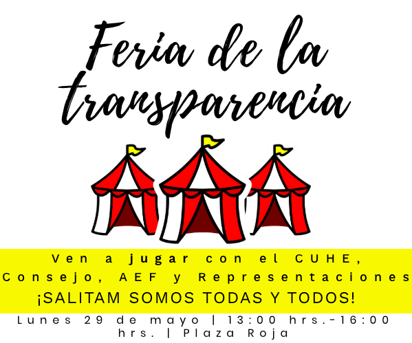 El CUHE, el Consejo de Alumnos, la AEF y las Representaciones de Alumnos te invitan a jugar con ellos en la "Feria de la transparencia" que tendrá lugar en el espacio de los stands de Plaza Roja, en un horario de 1 pm a 4 pm.