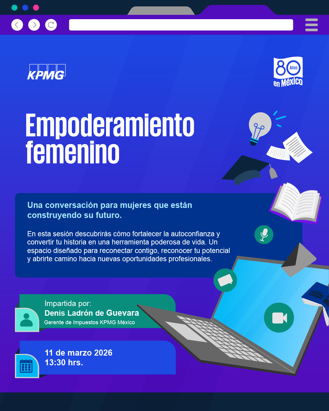 Conéctate este 11 de marzo a las 13:30 horas a la sesión: Empoderamiento Femenino. Impartida por Denis Ladrón de Guevara, Gerente de Impuestos para KPMG en México.