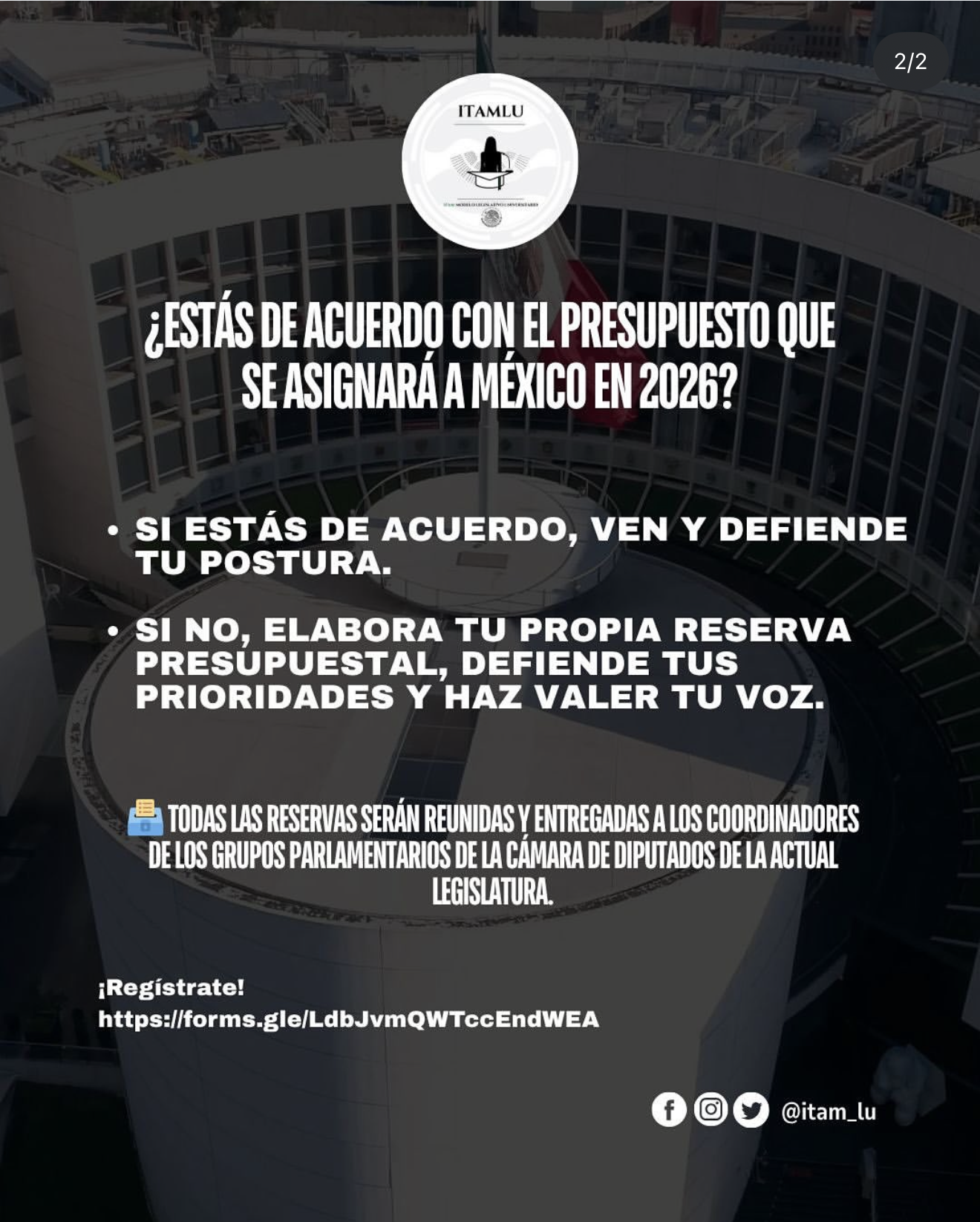 * Aclaración: La discusión del Presupuesto de Egresos de la Federación es una atribución exclusiva de la Cámara de Diputados. Por única ocasión, esta simulación se realizará en la Cámara de Senadores, espacio facilitado especialmente para la comunidad ITAM.