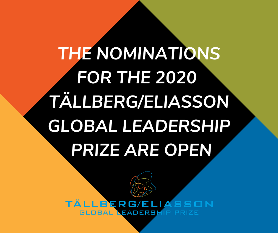 Usted puede identificar y nominar a un líder que cree que tiene la capacidad de abordar la complejidad de los desafíos del siglo XXI de manera innovadora, arriesgada y ética, y cuyo trabajo es global en aspiración o implicación y tiene sus raíces en valores universales. La junta de la Fundación Tällberg determina el número de premios que se otorgarán, que van de dos a cuatro. La fecha límite para hacer nominaciones es el viernes 17 de abril. Puede hacer su nominación aquí: https://eliassongloballeadership.org