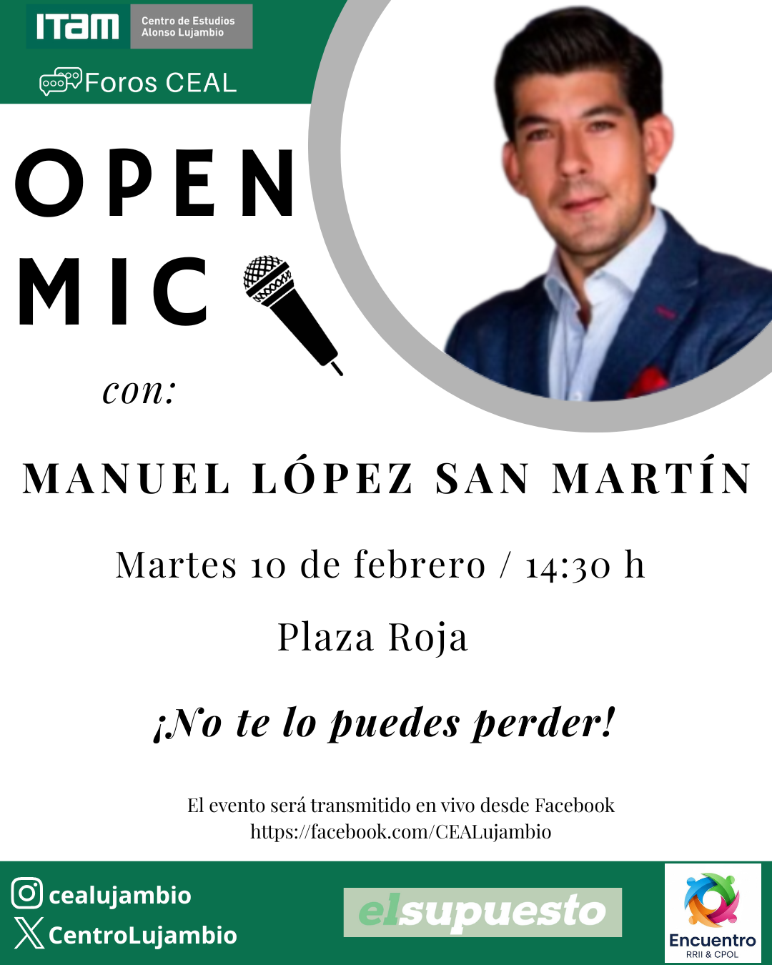 El Centro de Estudios Alonso Lujambio (CEAL) te invita a un Open Mic con Manuel López San Martín, destacado periodista y analista político, este 10 de febrero en la Plaza Roja. Será un espacio abierto para conversar sobre actualidad, medios y política en México, hacer preguntas directas y compartir inquietudes de la comunidad estudiantil.