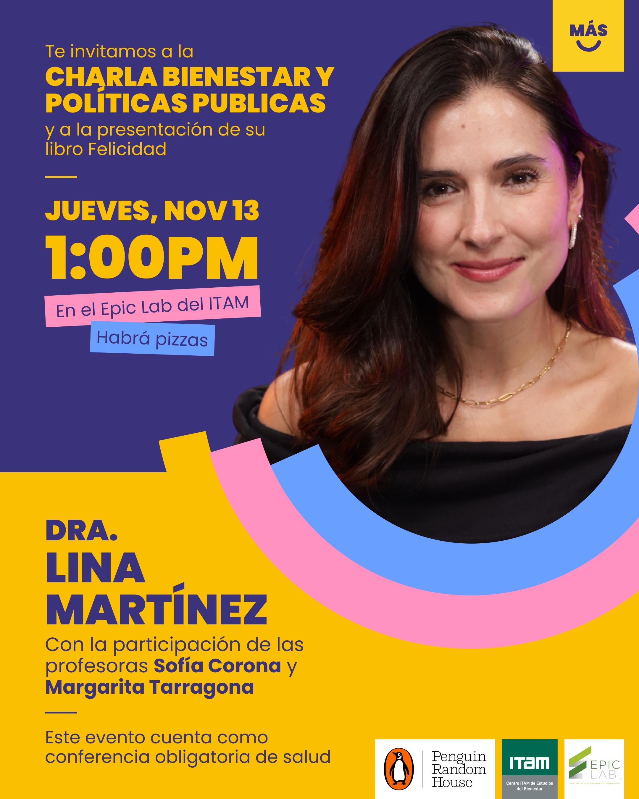 En este evento ella presentará algunos hallazgos de investigación sobre las políticas públicas que contribuyen al bienestar de las personas y posteriormente las profesoras del ITAM Sofía Corona y Margarita Tarragona harán una breve presentación del libro de la Dra. Lina Martínez.