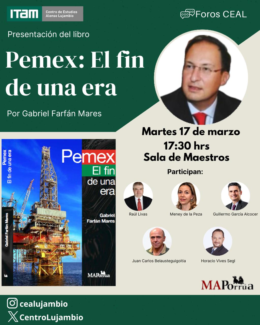 Este martes 17 de marzo te invitamos a la presentación del libro Pemex: El fin de una era, de Gabriel Farfán, en un diálogo sobre el papel de Pemex en la economía mexicana y los retos que enfrenta hacia adelante. La obra será comentada por profesores del ITAM, en un formato de conversación y análisis.