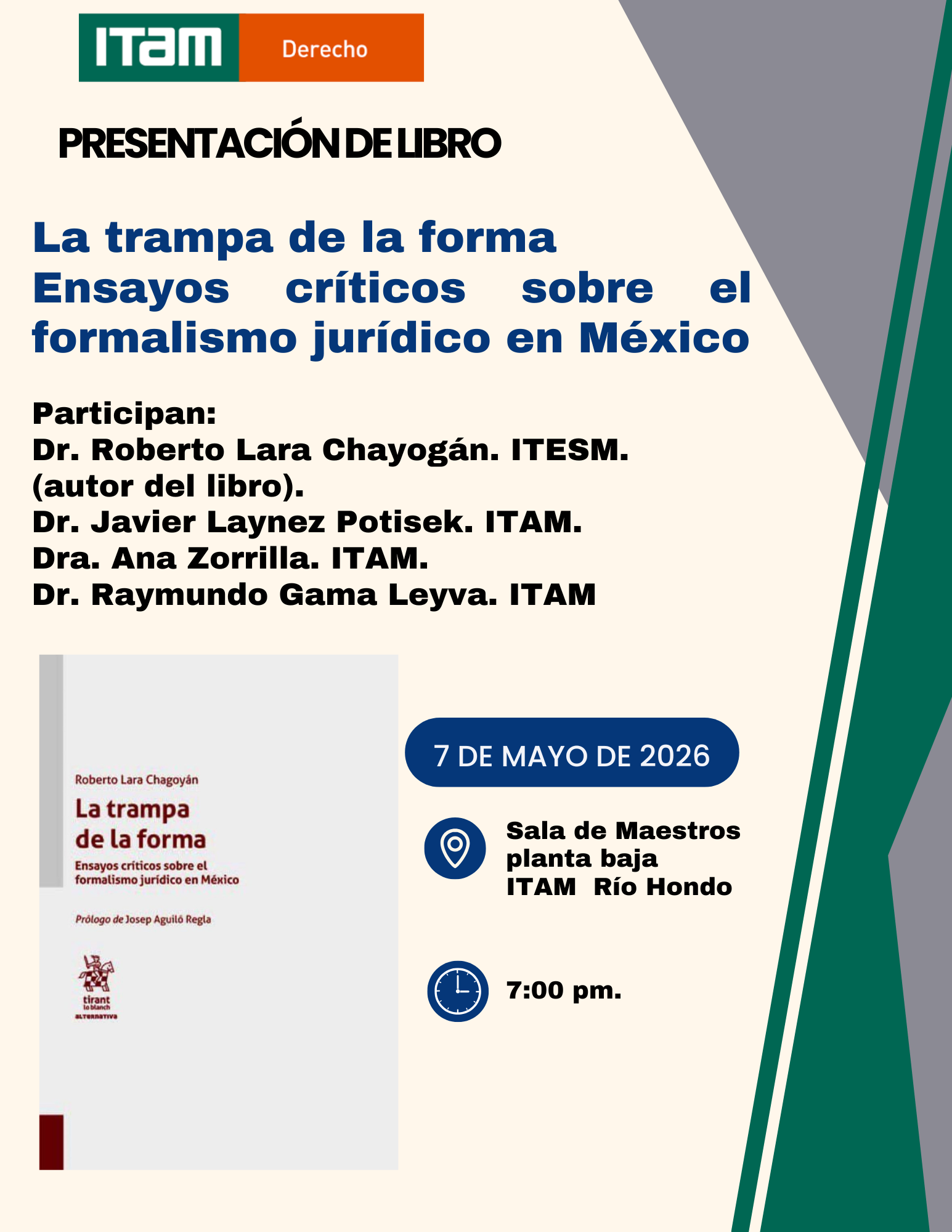 El Departamento Académico de Derecho te invita a la presentación del libro "La trampa de la forma. Ensayos críticos sobre el formalismo jurídico en México" que se llevará a cabo el 7 de mayo a las 19:00 hrs. en la Sala de Maestros planta baja del campus Río Hondo.