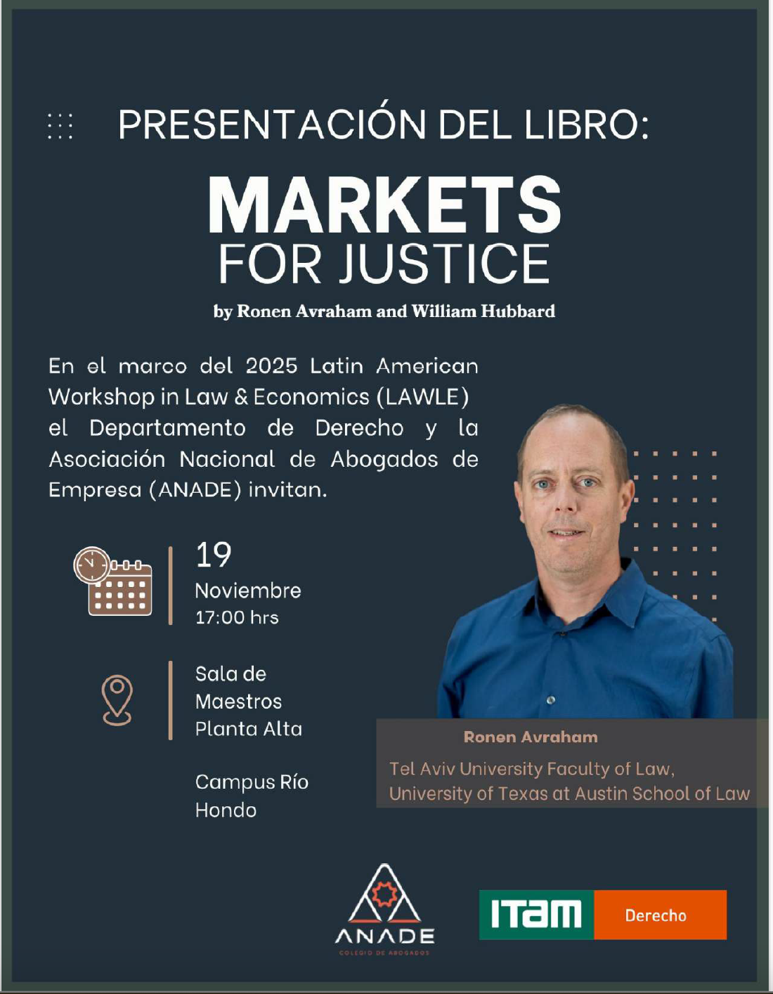 El Departamento Académico de Derecho del ITAM y la Asociación Nacional de Abogados de Empresa (ANADE) te invitan a la presentación del libro "Markets for Justice" de Ronen Avraham y William Hubbard que se llevará a cabo en el marco del Latin American Workshop in Law and Economics (LAWLE) 2025.