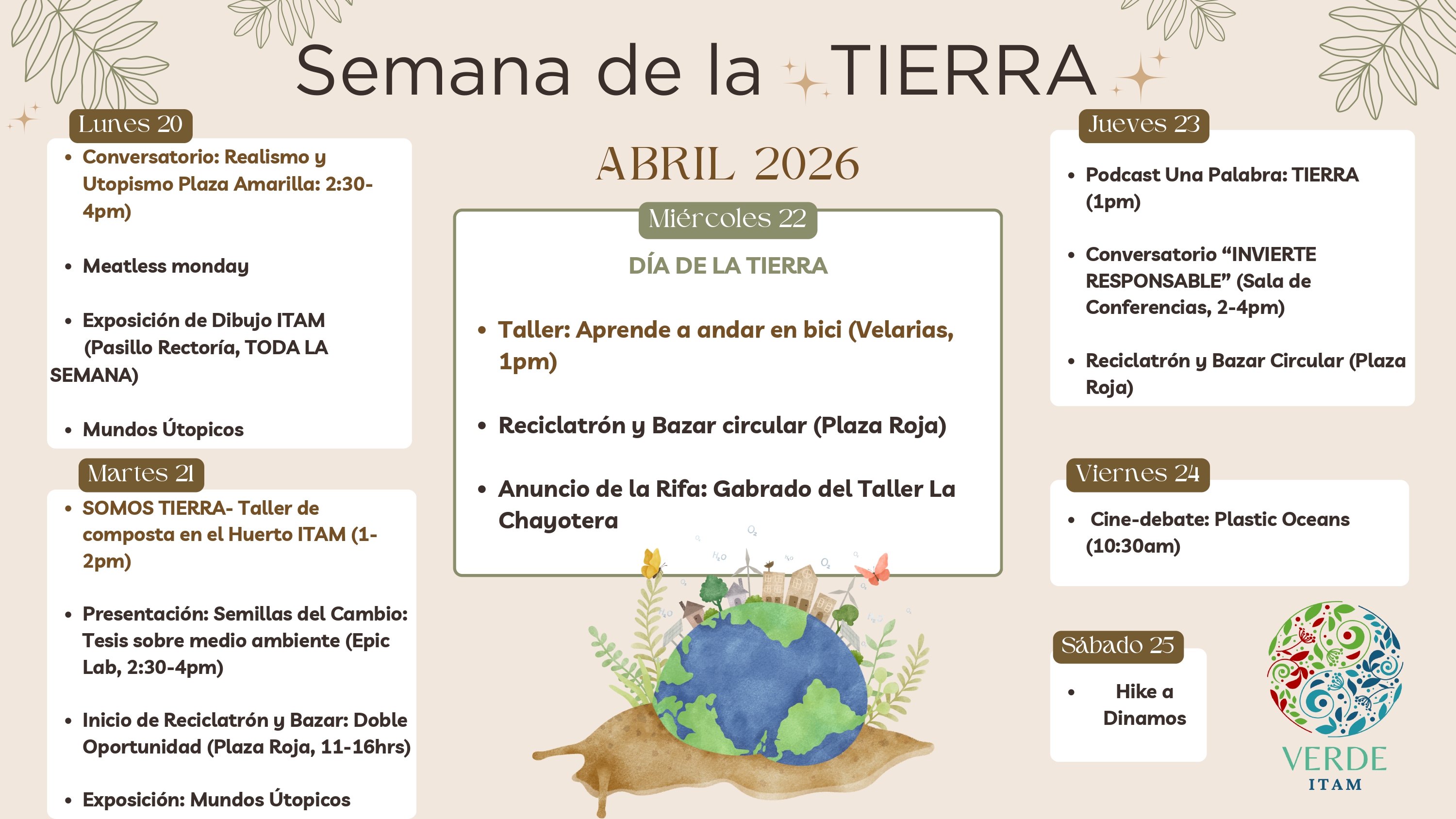 Del 20 al 25 de abril, Verde ITAM invita a la comunidad universitaria a participar en la Semana de la Tierra, un espacio de reflexión, aprendizaje y acción en torno a la sostenibilidad y el cuidado del medio ambiente.