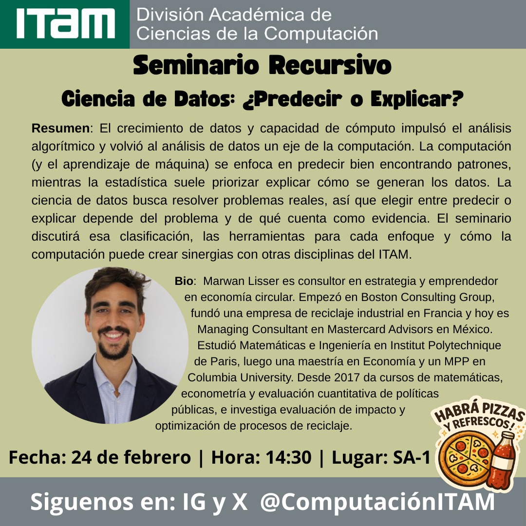 La División Académica de Ciencias de la Computación los invita al Seminario Recursivo "Ciencia de Datos: ¿Predecir o Explicar" que impartirá el M.C. Lisser Marwan