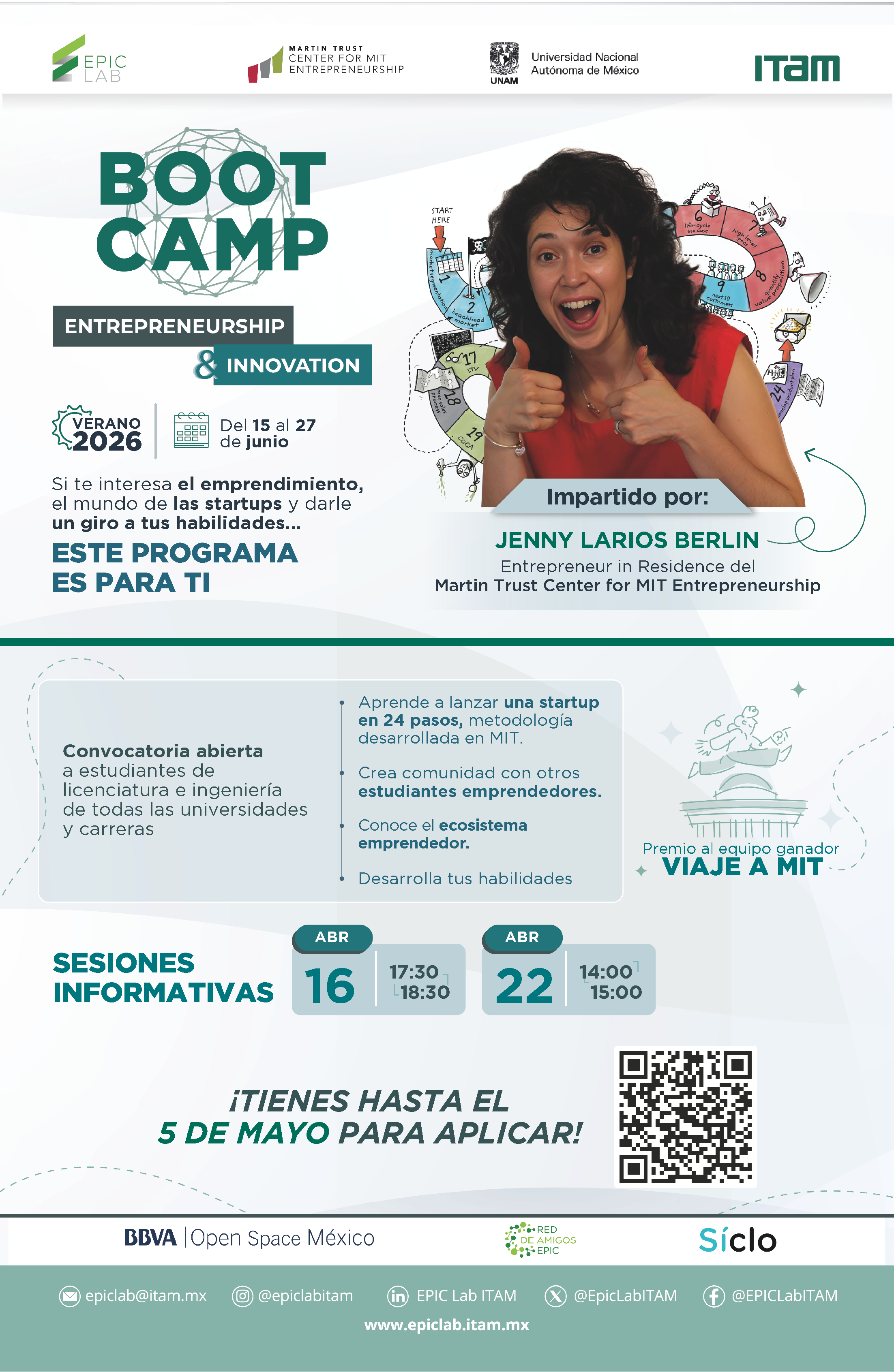 Este programa, impartido por Jenny Larios, Entrepreneur in Residence del Martin Trust Center for MIT Entrepreneurship, está abierto a cualquier estudiante del ITAM, de cualquier semestre y carrera, que quiera acercarse al ecosistema emprendedor y aprender una metodología para emprender.