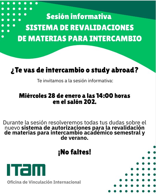 La oficina de Vinculación internacional, te invita a la Sesión Informativa del Sistema de Revalidaciones de Materias, resolveremos todas tus dudas, sobre el nuevo sistema de revalidaciones.