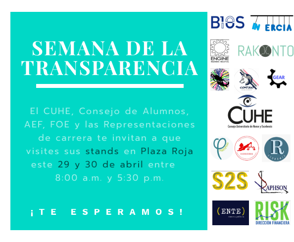 Con motivo de la Semana de la Transparencia; el CUHE, el Consejo de Alumnos, la AEF, el Comité Técnico del FOE y las Representaciones de Alumnos invitan a toda la comunidad estudiantil a visitar los stands en Plaza Roja.
