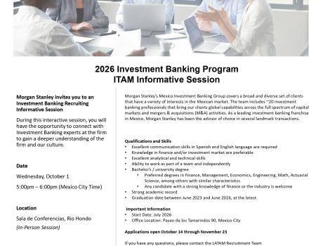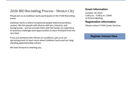 Goldman Sachs en conjunto con la Oficina de Career Services del ITAM te invita a su sesión de reclutamiento presencial, dirigida a todos los alumnos...